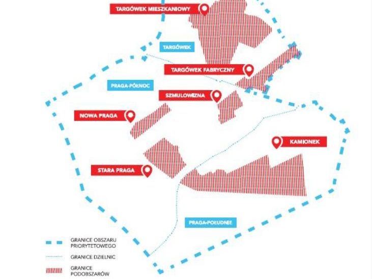 Zacznijmy od terenu, na którym mogą być realizowane zadania, których dotyczy konkurs, ponieważ kwestia ta budzi wątpliwości. Teren ten to obszar priorytetowy określony dla Zintegrowanego Programu Rewitalizacji, w którego granicach mieści się Praga Północ, Targówek Fabryczny i Mieszkaniowy oraz Kamionek. Szczegółowa mapa znajduje się na 28 str. ZPR. Nie dotyczy zaś pozostałych obszarów włączonych do ZPR-u, a znajdujących się w dzielnicach: Mokotów, Bemowo, Włochy i Ursus!