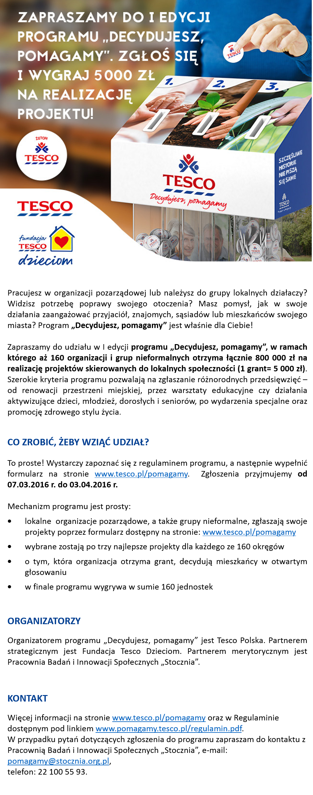 Od poniedziałku, 7 marca rusza nabór wniosków do I edycji programu „Decydujesz, pomagamy”. Mechanizm zgłaszania projektu jest niezwykle prosty – wystarczy wejść na stronę www.tesco.pl/pomagamy oraz uzupełnić formularz o krótki opis planowanego przedsięwzięcia. Wnioski można składać do 3 kwietnia 2016 roku. Nie ma ograniczeń dotyczących tematyki projektu. Mogą to być różnorodne inicjatywy np. edukacyjne, artystyczne, integracyjne, ekologiczne, sąsiedzkie czy dotyczące zagospodarowania przestrzeni publicznej. Ważne jednak, by angażowały one mieszkańców i miały realny wpływ na zmianę najbliższego otoczenia na lepsze. Do programu mogą przystąpić zarówno organizacje pozarządowe, jak również grupy nieformalne. W ten sposób organizatorzy – Tesco Polska przy wsparciu Fundacji Tesco Dzieciom – wychodzą naprzeciw podmiotom, które chcą wcielić w życie ciekawe inicjatywy skierowane do lokalnych społeczności.