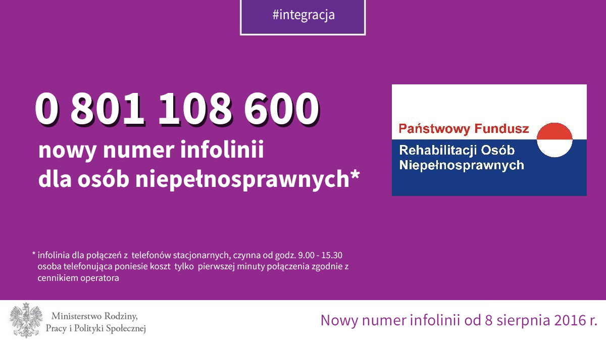 Od 8 sierpnia Państwowy Fundusz Rehabilitacji Osób Niepełnosprawnych (PFRON) uruchamia nowy dodatkowy numer infolinii dla osób niepełnosprawnych: 0 801 108 600 dla połączeń z telefonów stacjonarnych.