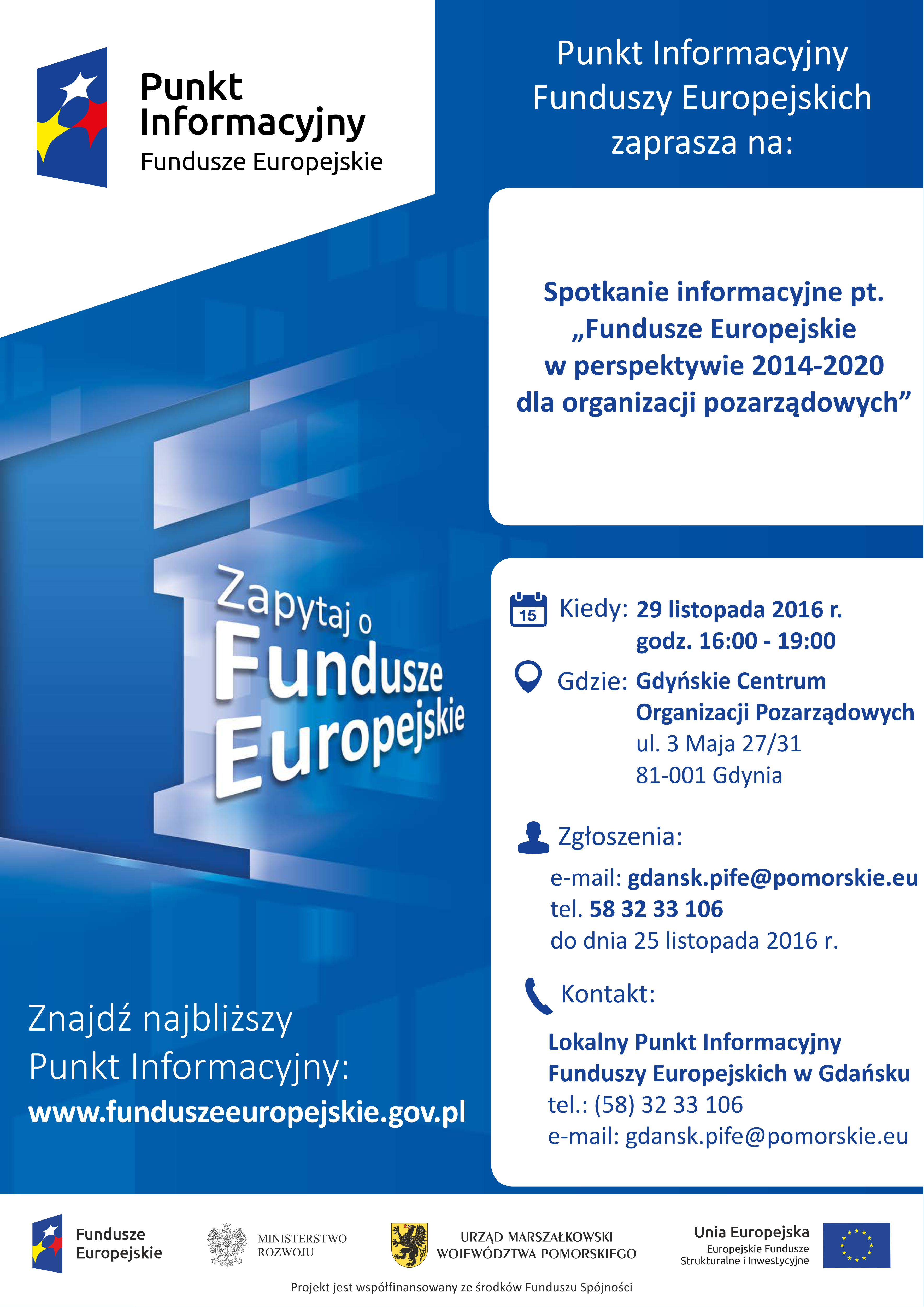 Lokalny Punkt Informacyjny Funduszy Europejskich w Gdańsku zaprasza na spotkania informacyjne organizowane 29 listopada 2016 r., poświęcone zagadnieniom wsparcia organizacji pozarządowych z Funduszy Europejskich na lata 2014-2020.