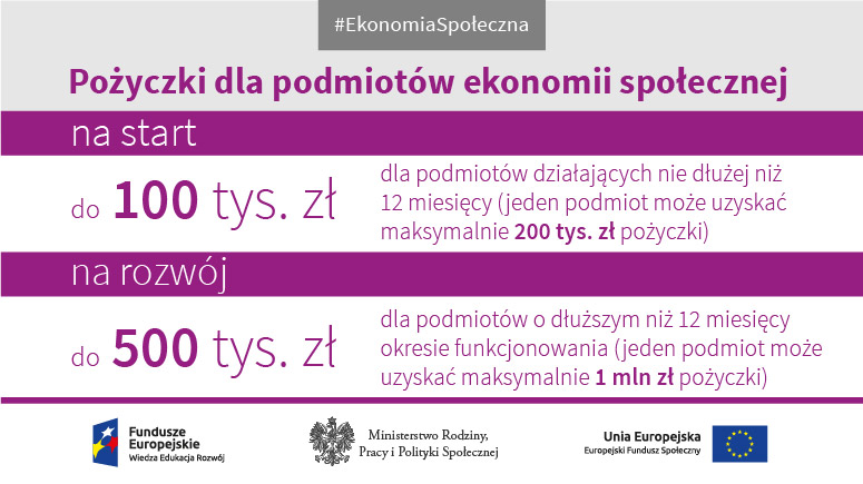 Pożyczka na start do wysokości 100 tys. zł – dla podmiotów działających nie dłużej niż 12 miesięcy (jeden PES może uzyskać maksymalnie 200 tys. zł pożyczki),