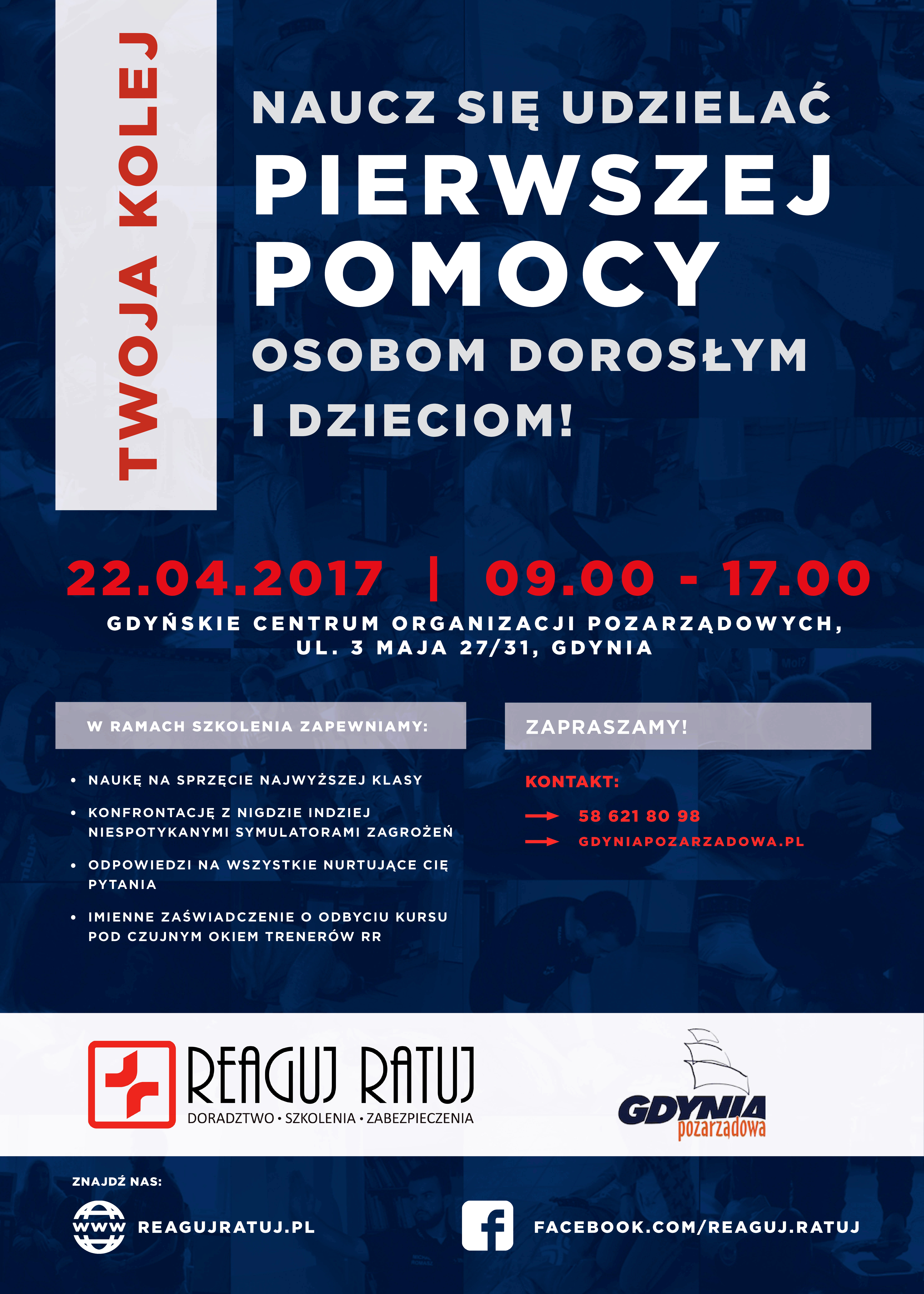 Zapraszamy serdecznie przedstawicieli gdyńskich organizacji pozarządowych i wolontariuszy z nimi współpracujących na szkolenie z Pierwszej Pomocy, które prowadzić będą osoby z firmy RR Reaguj Ratuj. Ideą firmy jest szerzenie wiedzy i zwiększanie świadomości oraz wyuczonych reakcji ludzi przy udzielaniu Pierwszej Pomocy poprzez szkolenia praktyczne.