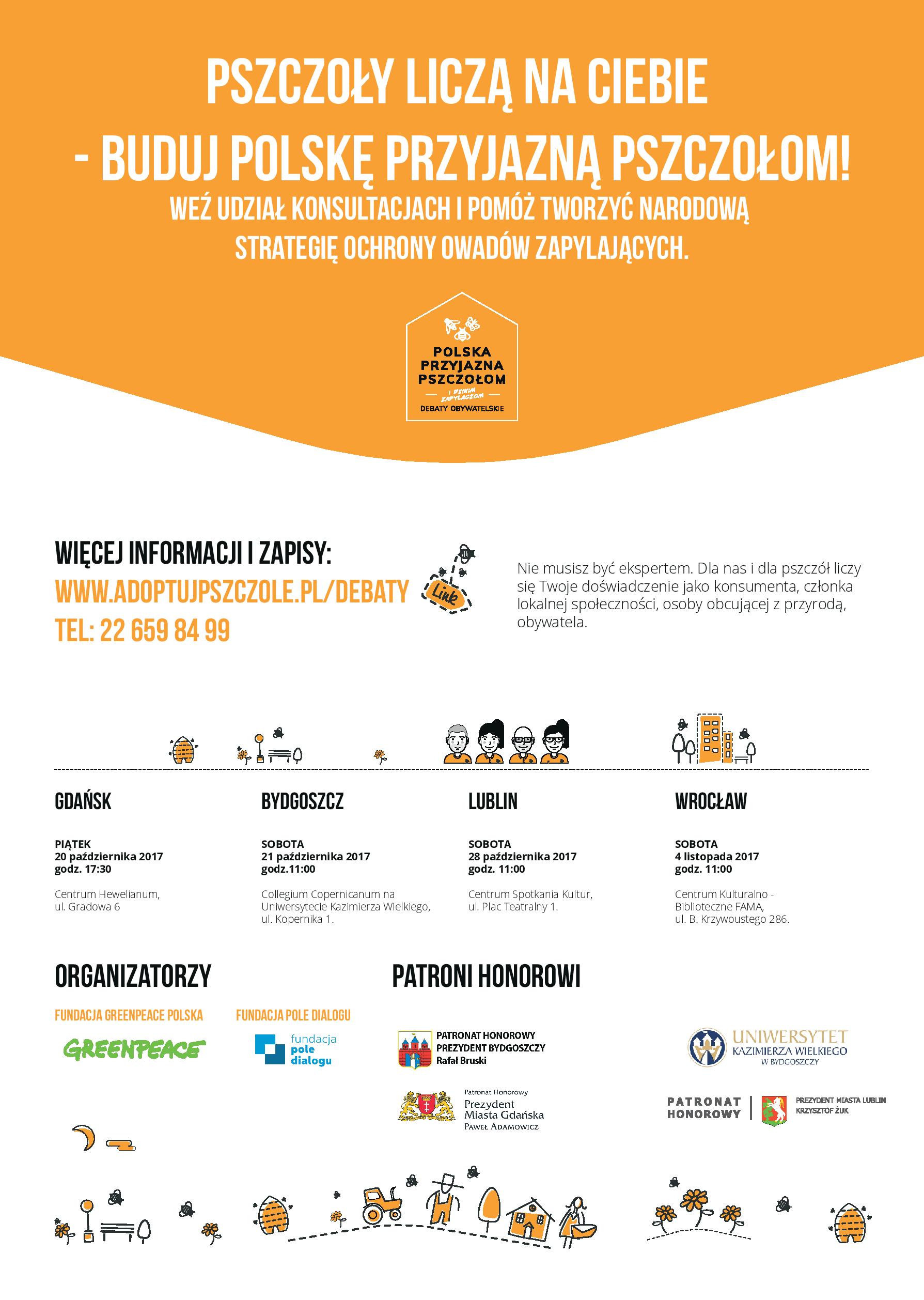 Przyszłość pszczół w Polsce zależy między innymi od tego, co 20 października wydarzy się w… Gdańsku. To tutaj odbędzie się pierwsza debata obywatelska na temat Narodowej Strategii Ochrony Owadów Zapylających. Mieszkańcy Trójmiasta mają dzięki temu wyjątkową okazję współtworzenia razem z ekspertami i naukowcami strategicznej całościowej wizji ochrony pszczół i innych owadów zapylających, która ma sprawić, że Polska stanie się krajem prawdziwie przyjaznym pszczołom i dołączy do światowej czołówki krajów, które taką wizję już wypracowały. Do udziału w debatach zapraszają wszystkich chętnych Greenpeace Polska i Fundacja Pole Dialogu – zapisy na stronie adoptujpszczole.pl/debaty.
