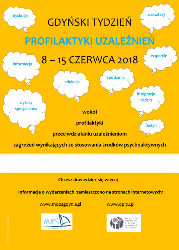 z funkcjonowania koalicji na rzecz gminnych programów przeciwdziałania uzależnieniom (Gminnego Programu Profilaktyki i Rozwiązywania Problemów Alkoholowych oraz Gminnego Programu Przeciwdziałania Narkomanii i Uzależnieniom Behawioralnym) w terminie od 8 do 15 czerwca 2018 roku będzie miał miejsce cykl wydarzeń o charakterze profilaktycznym. Jest on skierowany do szerokiego grona odbiorców, zarówno specjalistów w obszarze niesienia pomocy, jak i mieszkańców Gdyni w różnym wieku.