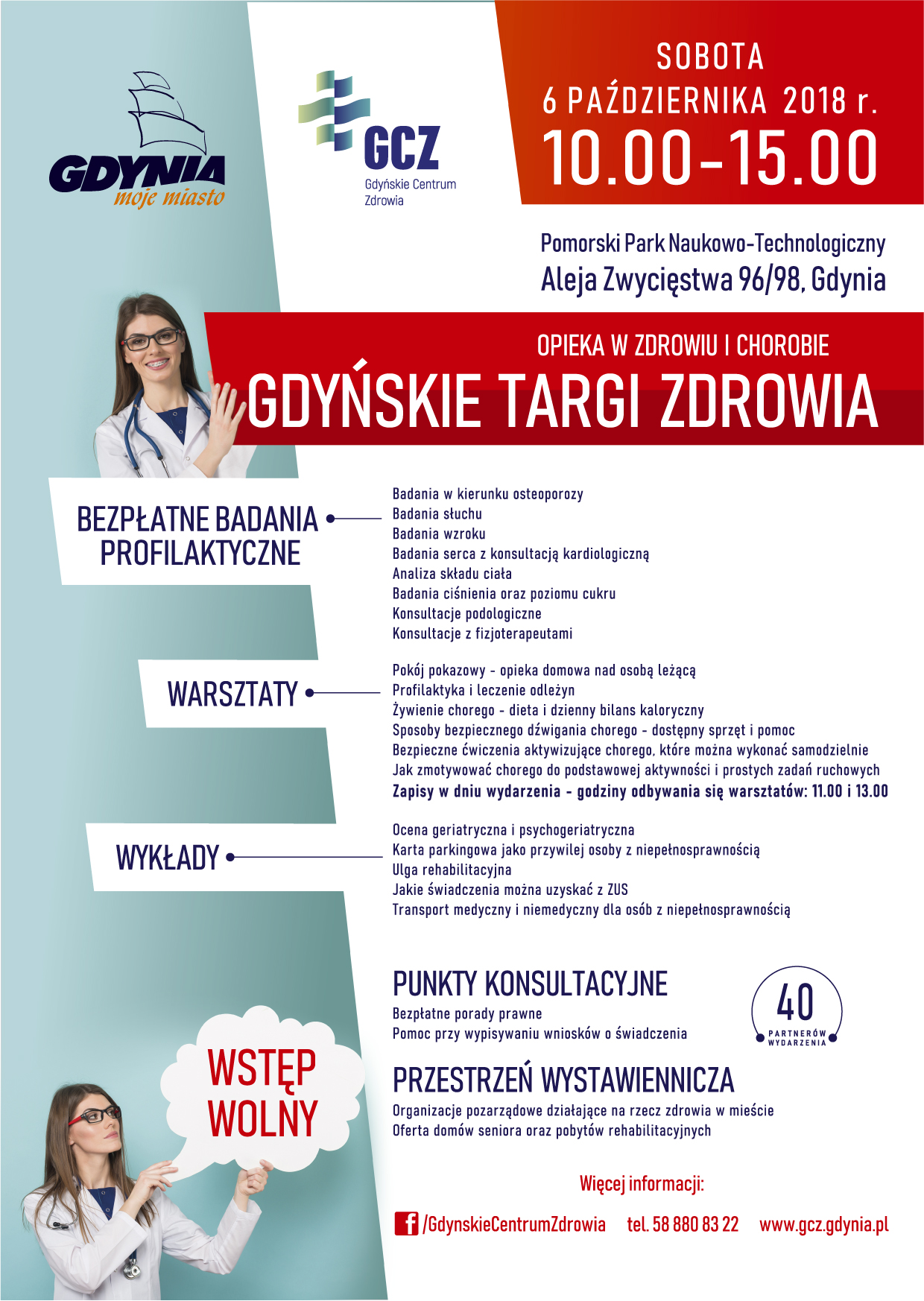 Wykwalifikowany personel, który poprowadzi sesje warsztatową, zaprezentuje najlepsze sposoby na to, jak najlepiej sprawować opiekę domową nad osobą chorą; pojawią się praktyczne porady jak bezpiecznie dźwigać chorego, oraz prezentacje sprzętu, który ułatwi proces opieki. W czasie całego wydarzenia dostępne będą bezpłatne badania profilaktyczne m.in. badania w kierunku osteoporozy, badania słuchu, kardiobus z konsultacją kardiologa, konsultacje okulistyczne oraz podologiczne. Na stanowiskach wystawienniczych będzie można poznać ofertę wielu organizacji, które prężnie działają na rzecz zdrowia, a to wszystko w jednym miejscu – 6 października 2018 roku w Pomorskim Parku Naukowo-Technologicznym w godzinach 10:00 – 15:00.