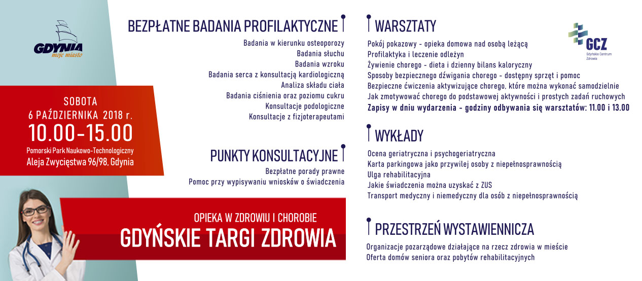 Zapraszamy 6 października 2018 roku do Pomorskiego Parku Naukowo-Technologicznego, gdzie odbędą się Gdyńskie Targi Zdrowia pt. „Opieka w zdrowiu i chorobie”. Gdyńskie Centrum Zdrowia jest pomysłodawcą i organizatorem wydarzenia, które ma na celu pomóc mieszkańcom pozyskać wiedzę dotyczącą możliwości, jakie są dostępne, aby zadbać o zdrowie oraz dotrzeć do właściwej organizacji wspierającej leczenie i opiekę w chorobie.