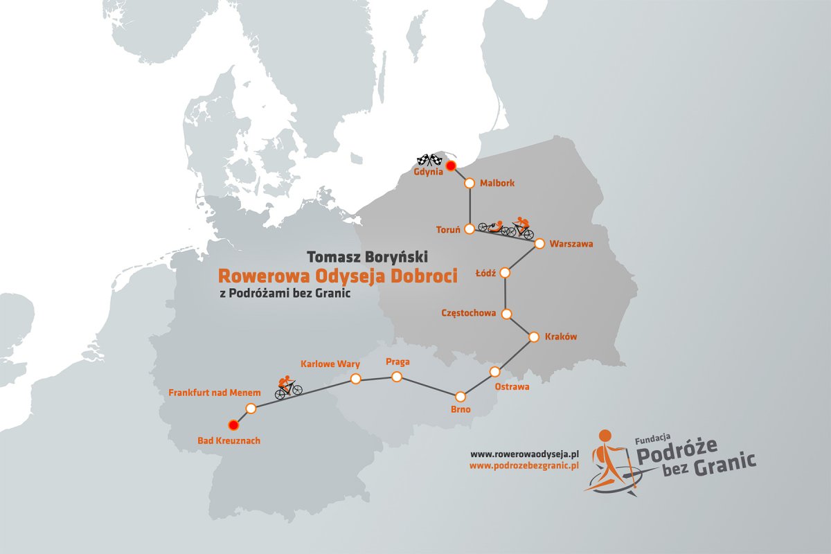 W imieniu fundacji Podróże Bez Granic zapraszam Państwa do zapoznani się z ideą akcji charytatywnej „Rowerowa odyseja Dobroci” podczas której Tomasz Boryński przejedzie na rowerze 2000 km z Niemiec, przez Czechy do Polski, a na wybranych odcinkach będą mu towarzyszyli rowerzyści z niepełnosprawnością. Ta niezwykła podróż, podczas której organizujemy zbiórkę publiczną na cele charytatywne rozpoczęła się 6 kwietnia 2019 w miejscowości Bad Kreuznach w południowo-zachodnich Niemczech.