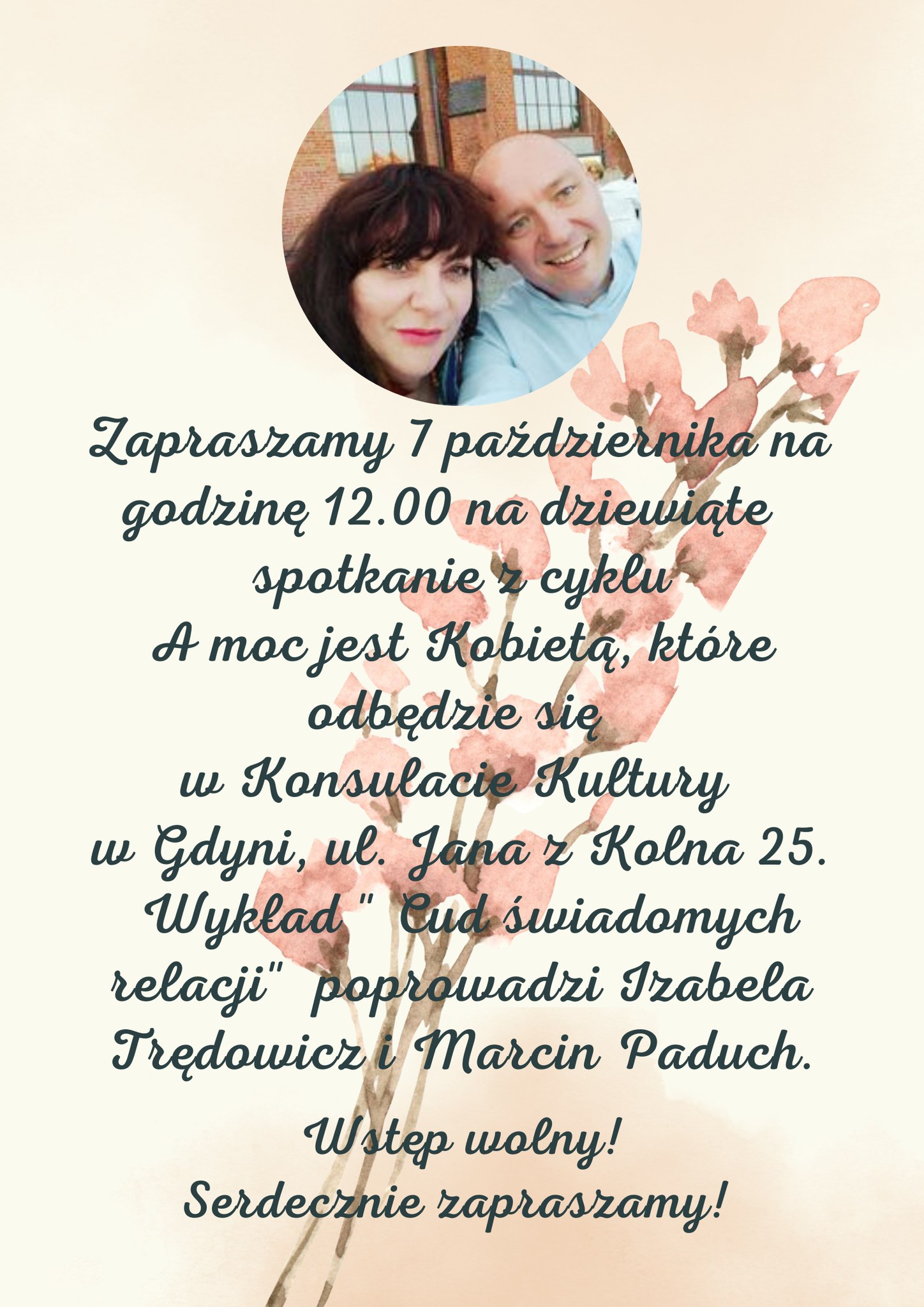 Tym razem opowiemy o ,,Cudzie świadomych relacji”. Spotkanie poprowadzi Izabela Trędowicz oraz Marcin Paduch. Poruszone zostaną tematy dotyczące współczesnych relacji i ich funkcjonowania, będących jednocześnie w przestrzeni poznania siebie i własnych potrzeb. Jak kochać, rozumieć partnera, pozostając sobą a jednocześnie we dwoje. Jak okazywać miłość, dając sobie wolność i partnerowi, w uznaniu jego inności. Jak cieszyć się z bycia razem już dziś, bez potrzeby zmieniania czegokolwiek w drugim człowieku, doceniając go teraz, takim jaki jest, nie wybiegając w przyszłość. Jak po prostu kochać… aby kochać całe życie…